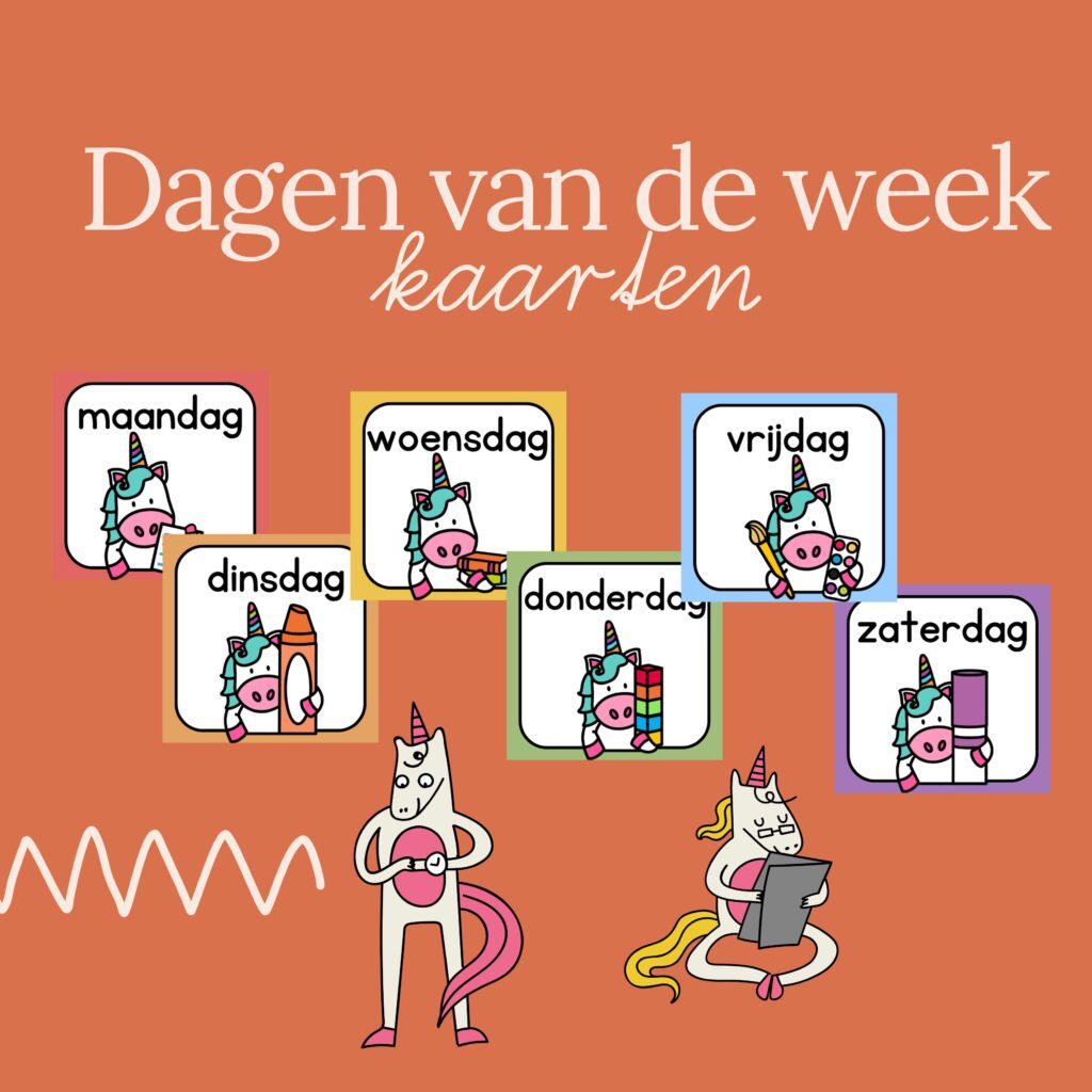 Kaartjes voor de dagen van de week in verschillende kleuren om het onthouden wat makkelijker te maken voor de kinderen…