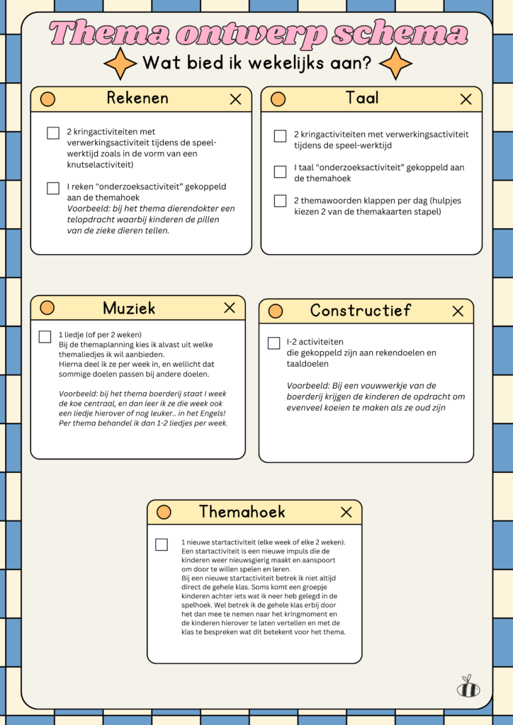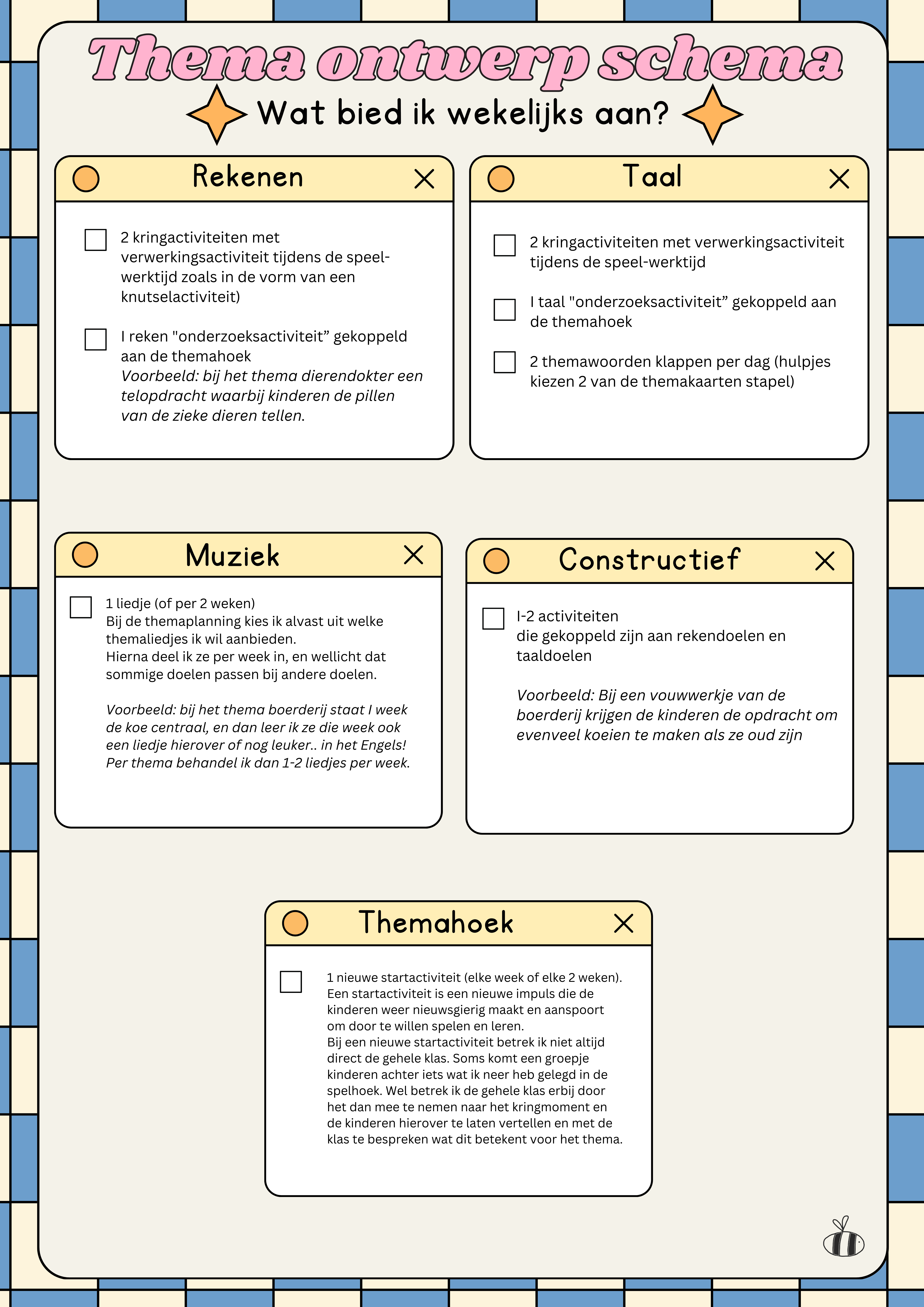 Nadat het thema is vastgesteld, ga ik altijd aan de slag met een themaplanning.In het begin vond ik het bij de kleuters lastig om een planning te maken, omdat je op zoveel leuke ideeën komt die je vaak wilt toevoegen aan je thema (vooral als je begint te zoeken op Pinterest, haha). Waar moet je beginnen en hoe ga je te werk? HELP!Allereerst is het belangrijk om in gedachten te houden dat een themaplanning niet vaststaat. Je beweegt mee met de leerlingen in je klas, en pas tijdens het thema zelf zie je waar het precies heen gaat. Toch is het belangrijk om alvast te plannen waar jij zelf naartoe wilt en waar je denkt dat de kinderen naartoe gaan met het thema. Dit helpt je bij het verzamelen of maken van materialen en bij het nadenken over hoe je dit op een leerlinggestuurde manier kunt overbrengen.De planning (en ook mijn opgestelde kleuterontwerpschema hiernaast) dient dus als leidraad.